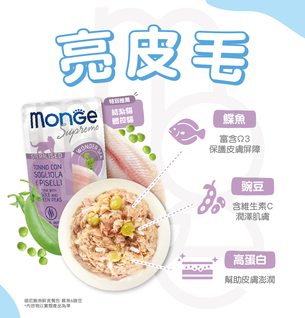 ●超好吃的原型鮮食,蒸氣烹調法,自然鎖鮮 ●ECVCN認證的獸醫營養師研製 ●添加益生元果寡糖(FOS),吸收更好 ●鰈魚,富含Ω3,保護皮膚屏障 ●豌豆,含維生素C,潤澤肌膚 ●高蛋白,幫助皮膚澎潤