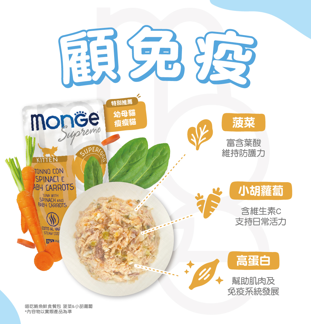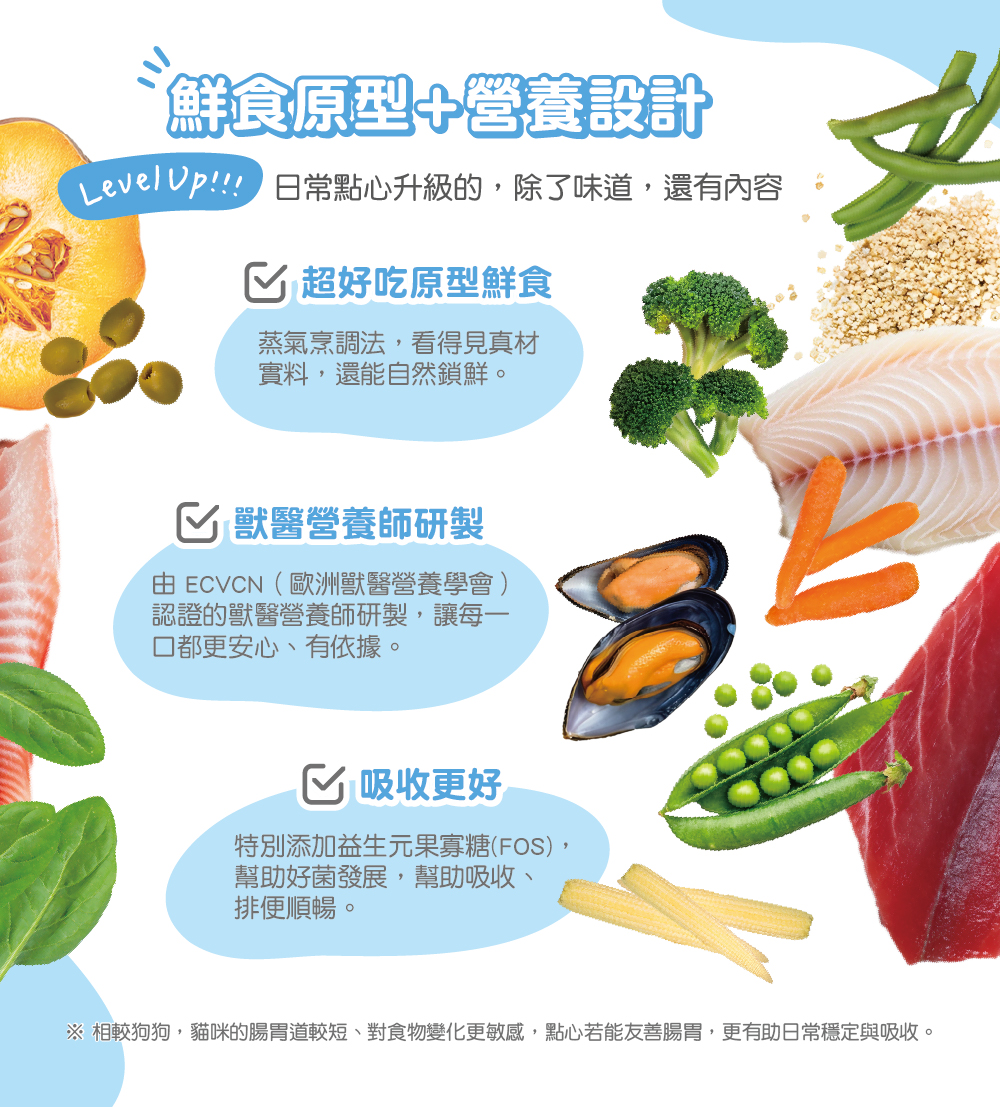 ●超好吃的原型鮮食,蒸氣烹調法,自然鎖鮮 ●ECVCN認證的獸醫營養師研製 ●添加益生元果寡糖(FOS),吸收更好 ●菠菜,富含葉酸,維持防護力 ●小胡蘿蔔,含維生素C,支持日常活力 ●高蛋白,幫助肌肉及免疫系統發展