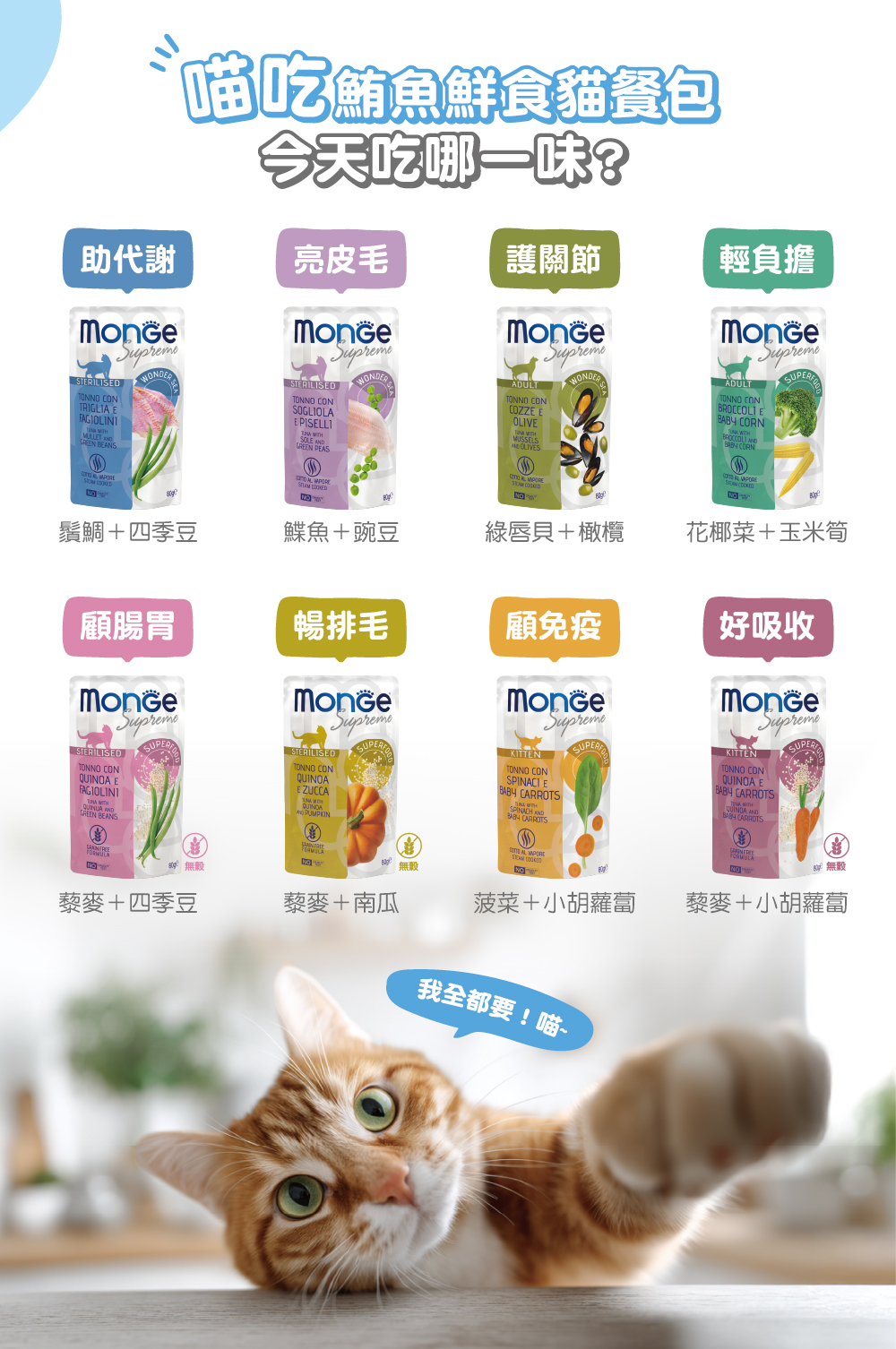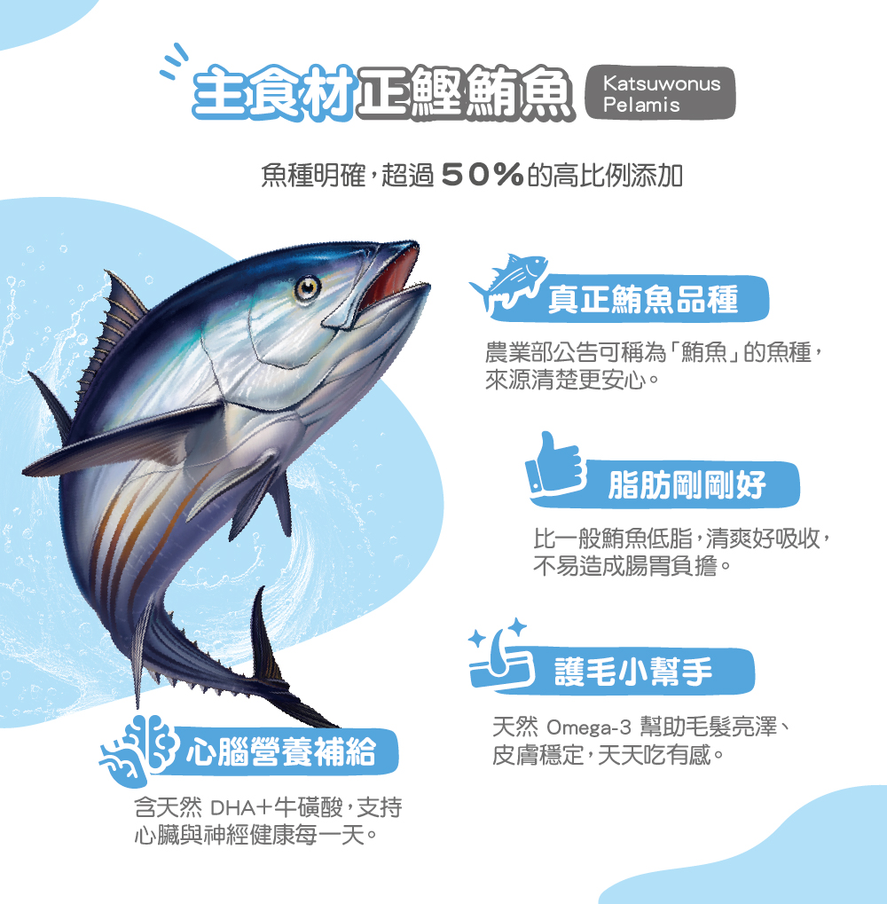 正鰹鮪魚50%,菠菜4%,小胡蘿蔔4%,米,葵花油,果寡糖(FOS)0.04%。