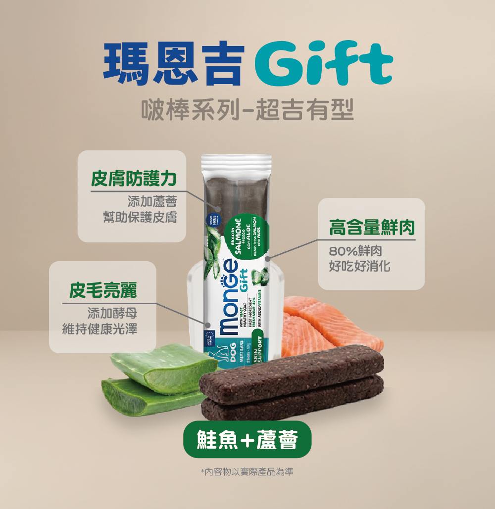 新鮮肉(75%),新鮮鮭魚(14%),水解動物蛋白(雞肉和豬肉),酵母產品(2%),礦物質,草本植物(蘆薈 0.1%)。