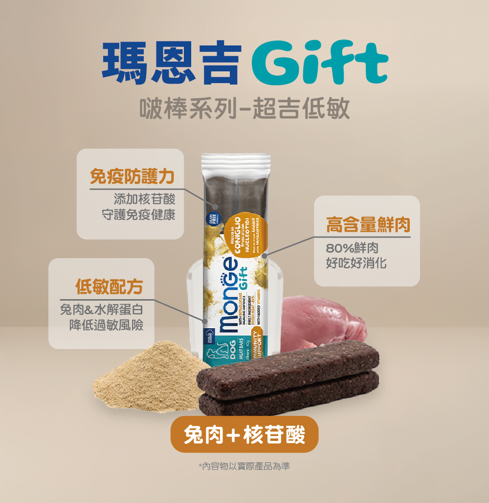 鮮肉(兔肉不少於14%,其餘可能含有火雞、雞、牛及豬等來源),水解動物蛋白(雞肉和豬肉),酵母產品(β-葡聚醣纖維約0.85%,核苷酸約0.12%),礦物質,維生素,牛磺酸。