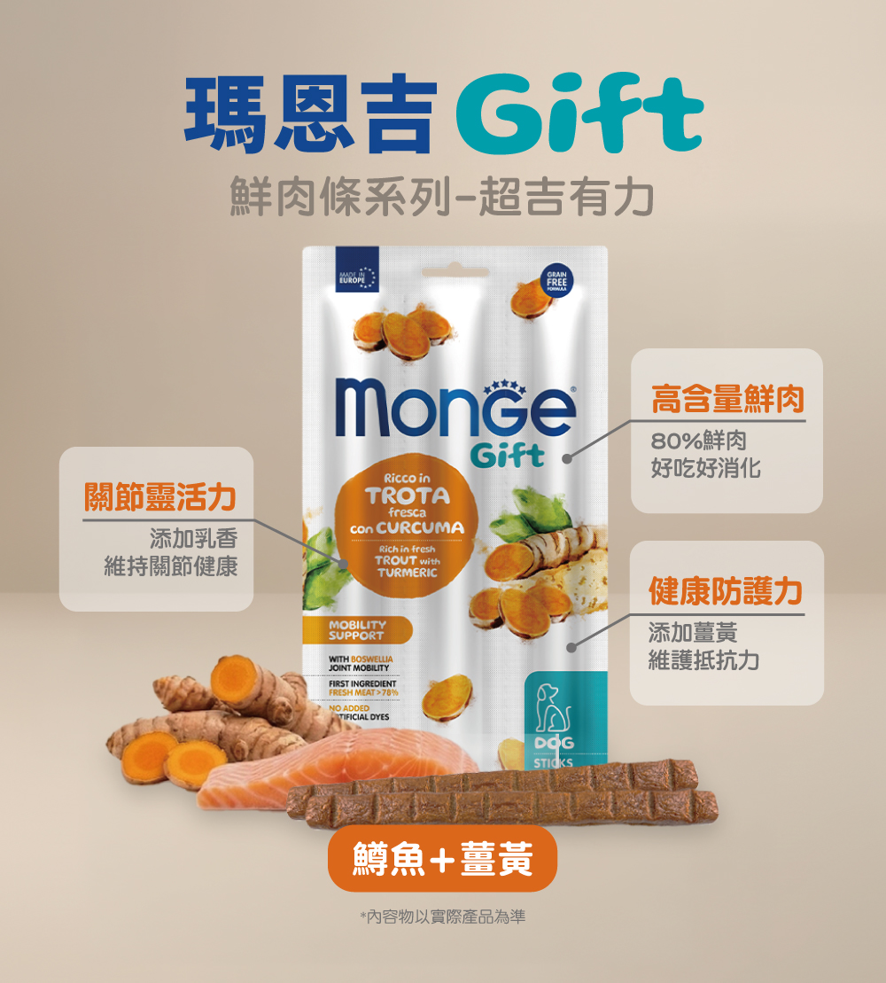 新鮮魚肉80%(鱒魚14%),乾燥魚肉(鮭魚和鱒魚),水解魚肉蛋白(鮭魚),纖維素粉,酵母產品,礦物質,薑黃粉(薑黃 1%),草本植物(乳香 0.2%)。