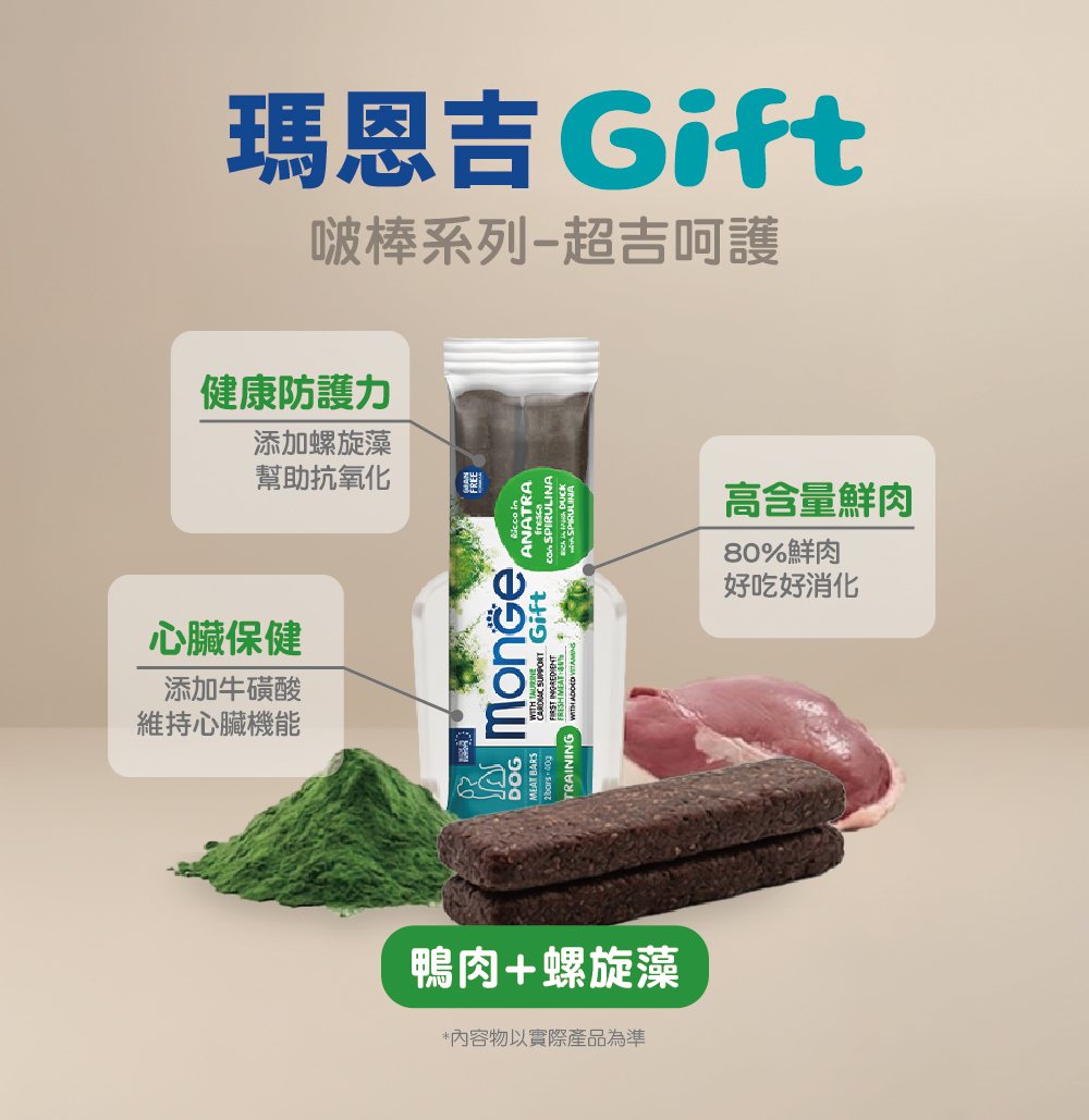鮮肉(鴨肉不少於14%,其餘可能含有火雞、雞、牛及豬等來源),水解動物蛋白(雞肉和豬肉),礦物質,海藻粉(螺旋藻約1%),維生素,牛磺酸。