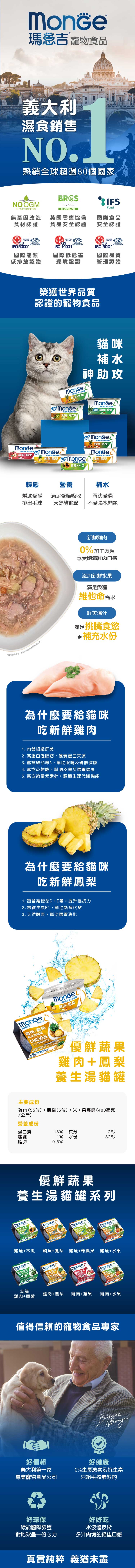 ●內含新鮮雞肉及鳳梨,滿足愛貓的食慾及天然維生素需求 ●富含鮮美湯汁,幫助愛貓補充水份 ●超過55%新鮮雞肉,享受優質鮮肉口感及香氣 ●特別添加果寡糖,幫助愛貓腸道健康 ●全程無殘忍動物實驗,不含色素、防腐劑與劣質脂肪