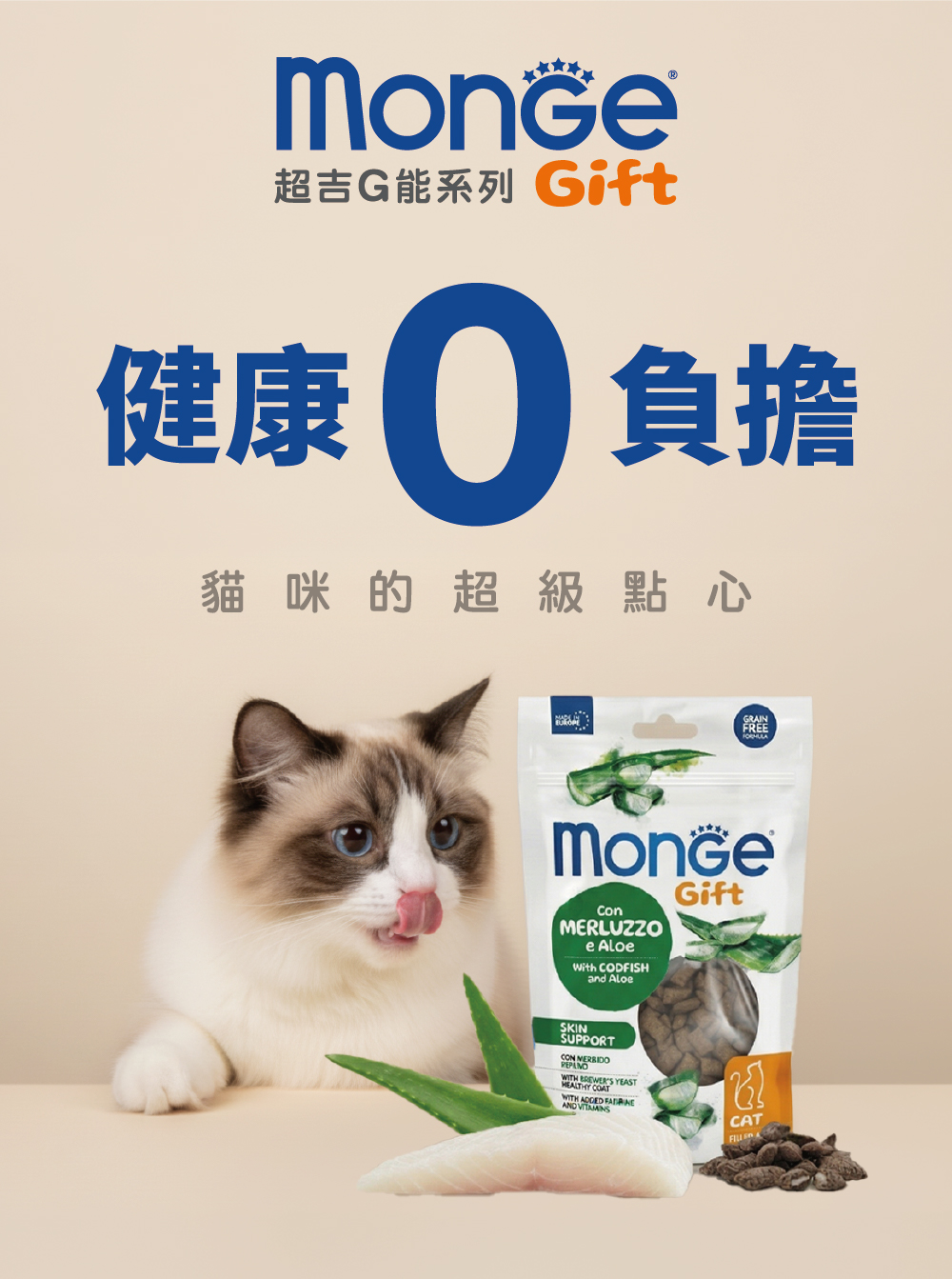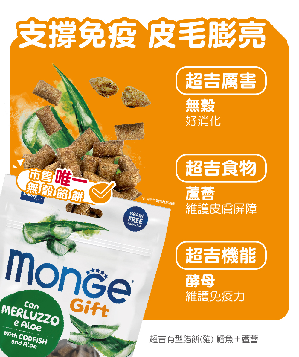 馬鈴薯,乾燥鱈魚(10%,相當於25%新鮮鱒魚),乾燥鮭魚,豌豆,動物脂肪(純度99.5%),水解動物蛋白(肝臟),魚油(鮭魚油0.5%),啤酒酵母(0.5%),礦物質,草本植物(蘆薈0.06%)。