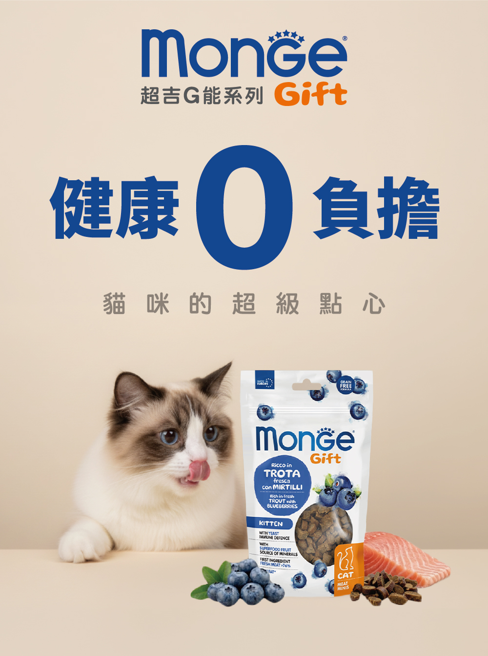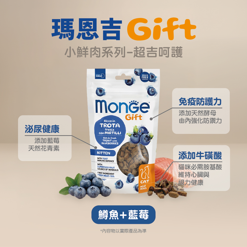 新鮮魚肉80%(鱒魚14%),乾燥魚肉(鮭魚和鱒魚),水解魚肉蛋白(鮭魚),纖維素粉,酵母產品(1%),乾燥藍莓(1%,相當於8.3%新鮮藍莓),礦物質。
