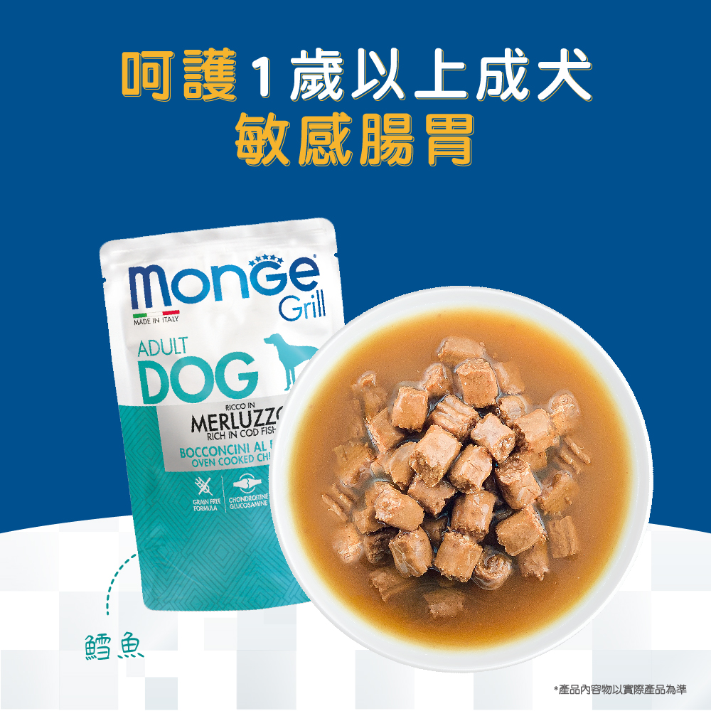 符合歐盟FEDIAF主食標準 ●100%無穀+鱈魚,呵護愛犬敏感腸胃 ●美味多汁的炙燒肉塊,滿足愛犬挑嘴食慾 ●蒸氣烘煮技術,完整保留肉塊營養及美味 ●添加葡萄糖胺及軟骨素,呵護愛犬關節健康 ●研發全程無殘忍動物實驗,不含色素、防腐劑與劣質脂肪