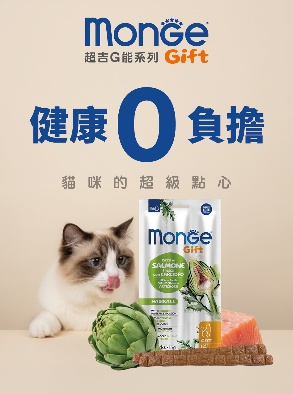 新鮮魚肉80.5%(鮭魚35%),乾燥魚肉(鮭魚和鱒魚),水解魚蛋白(鮭魚),纖維素粉(2.5%),酵母產品,礦物質,草本植物(朝鮮薊葉0.5%)。