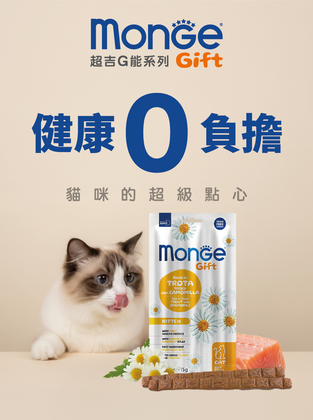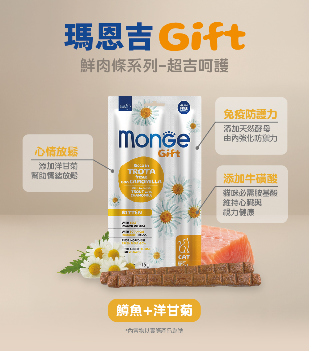新鮮魚肉81%(鱒魚14%),水解魚肉蛋白(鮭魚),乾燥魚肉(鮭魚和鱒魚),纖維素粉,酵母產品(2%),礦物質,草本植物(洋甘菊0.5%)。
