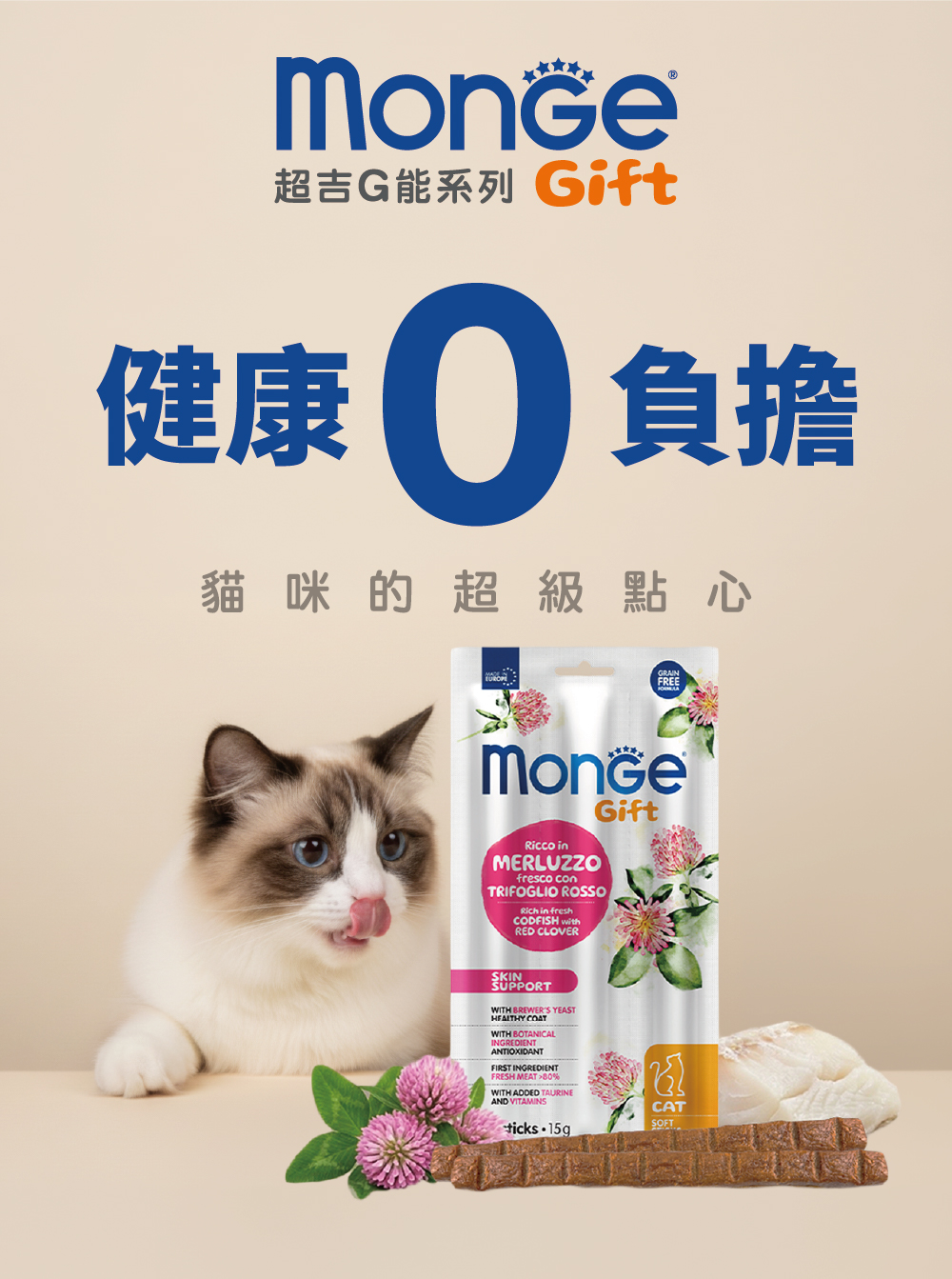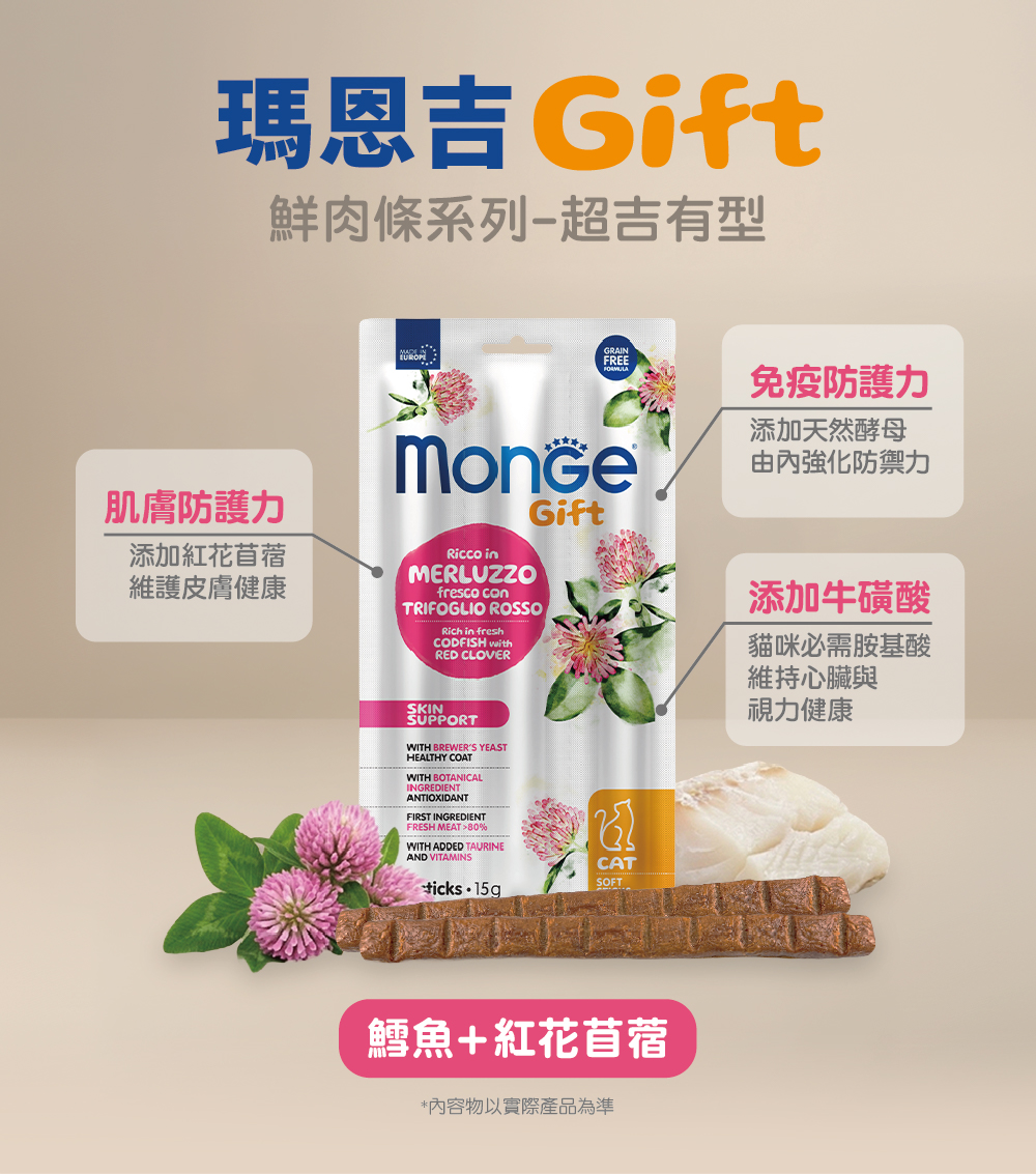新鮮魚肉80.5%(鱈魚46%),啤酒酵母(4.6%),水解魚肉蛋白(鮭魚),纖維素粉,酵母產品,礦物質,草本植物(紅花苜蓿0.5%)。