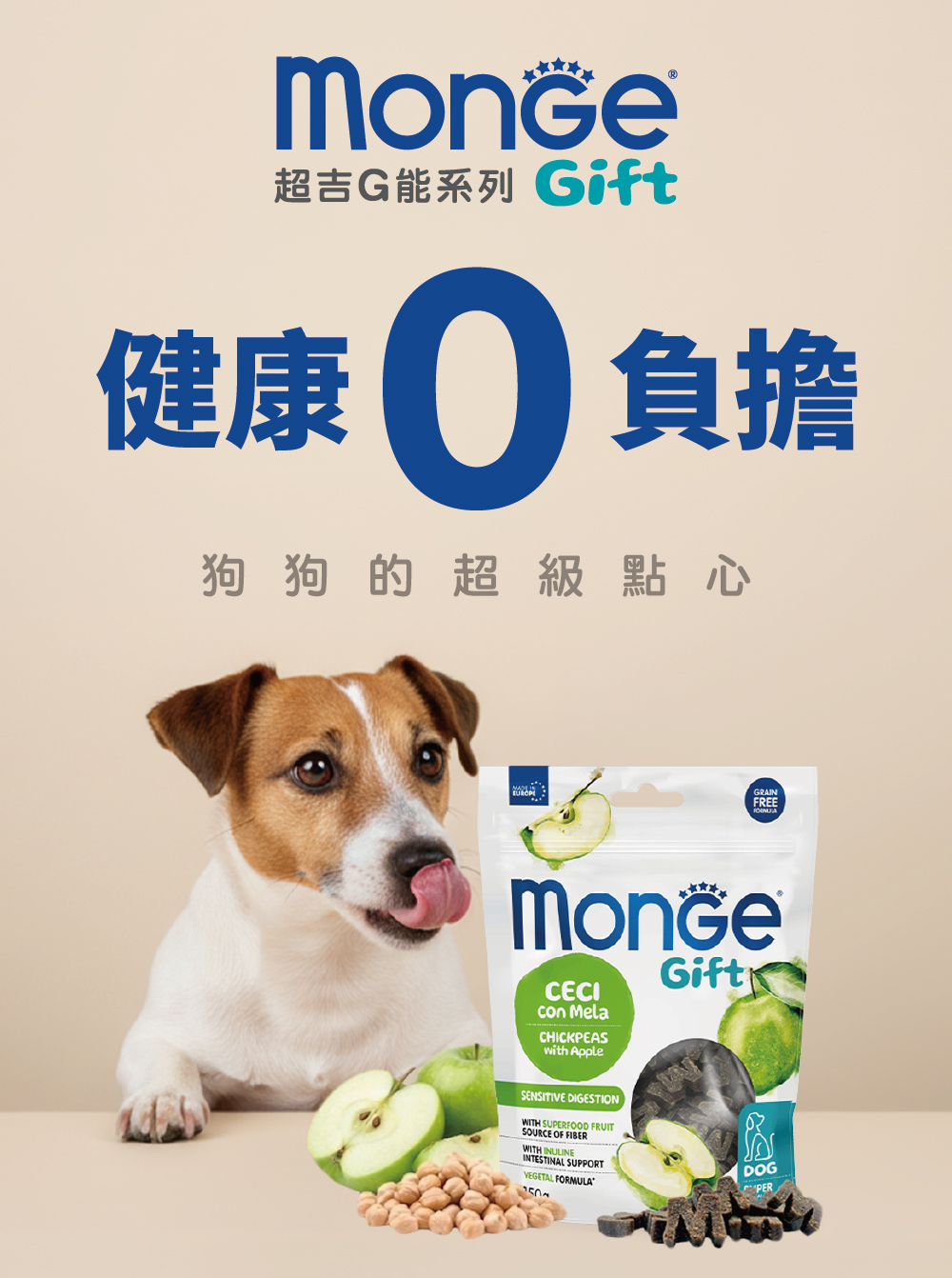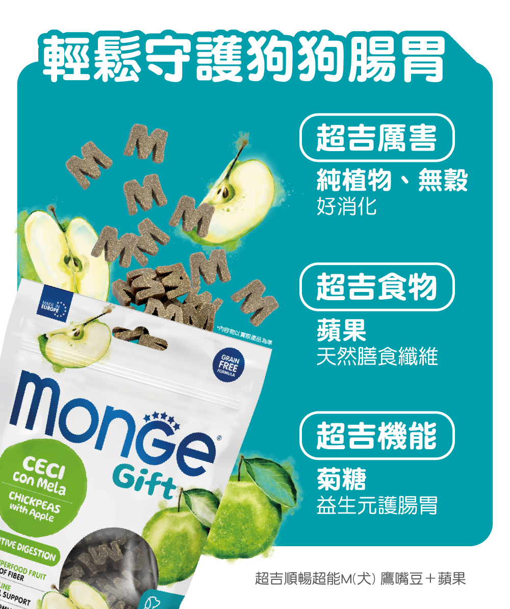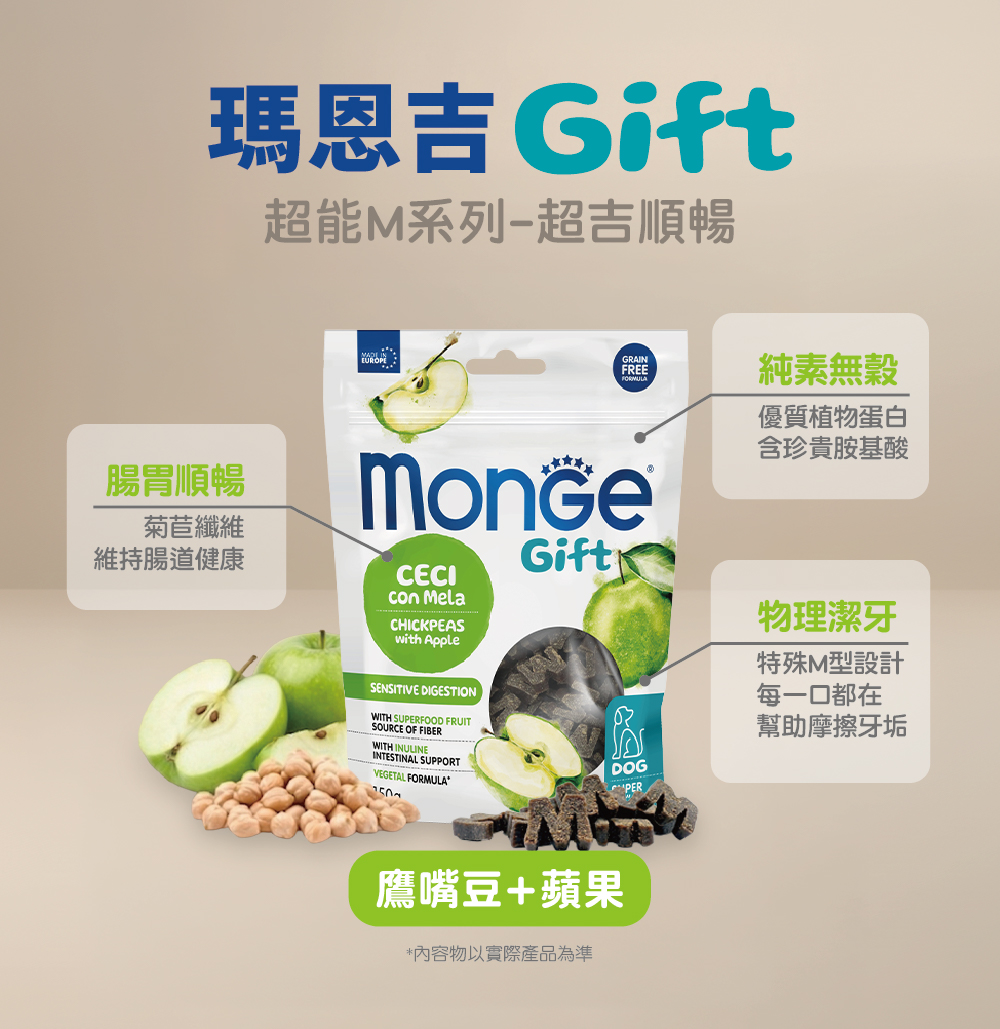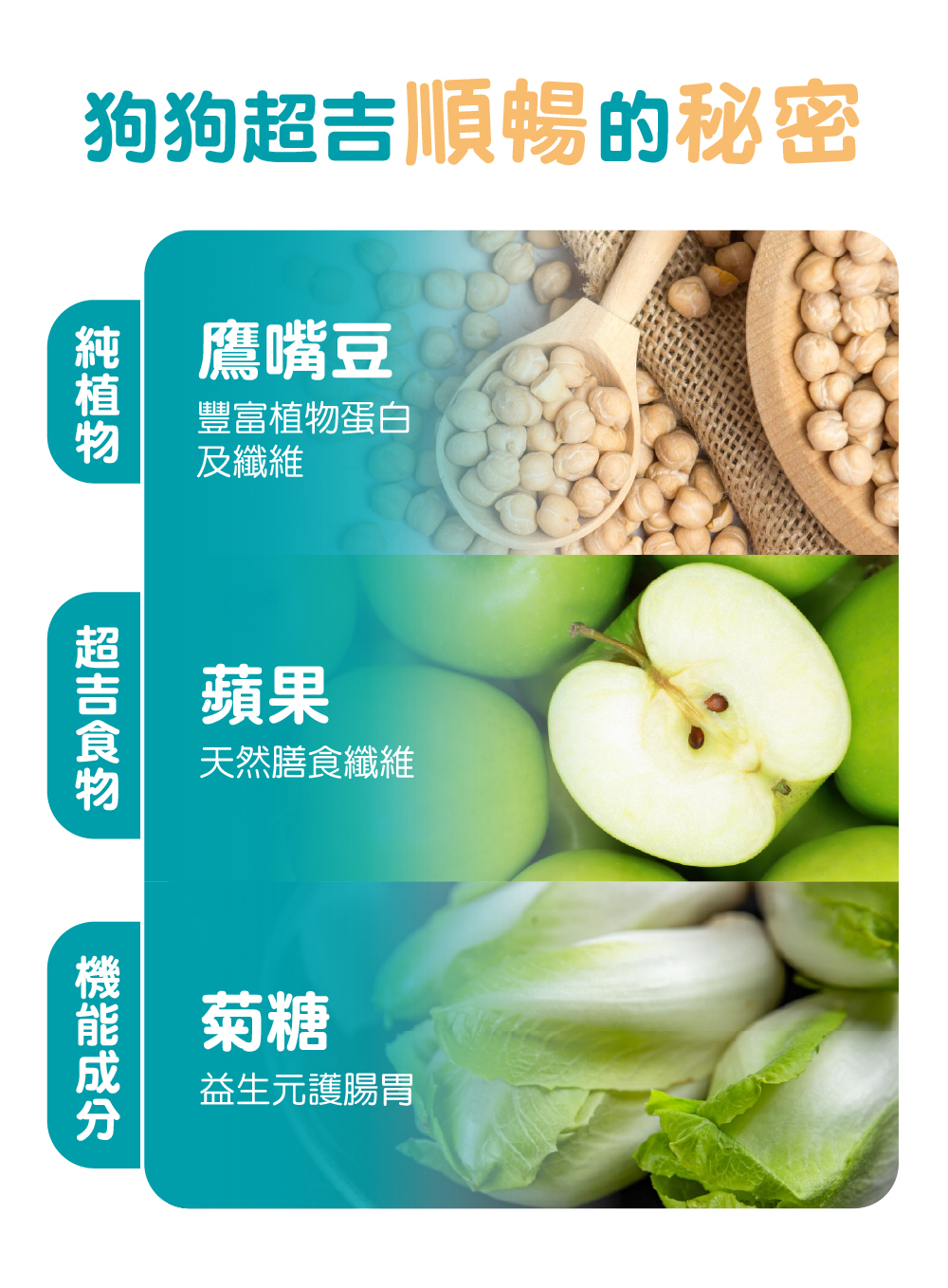 鷹嘴豆(50%),馬鈴薯,甘油,馬鈴薯澱粉,蘋果果漿 (4%),菊苣纖維(1%)。