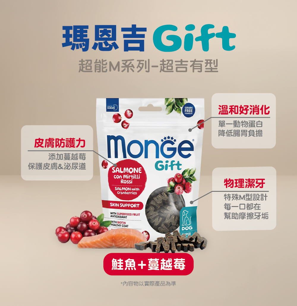 乾燥鮭魚(50%),馬鈴薯,甘油,馬鈴薯澱粉,乾燥蔓越莓(1%,相當於8.3%新鮮蔓越莓)。