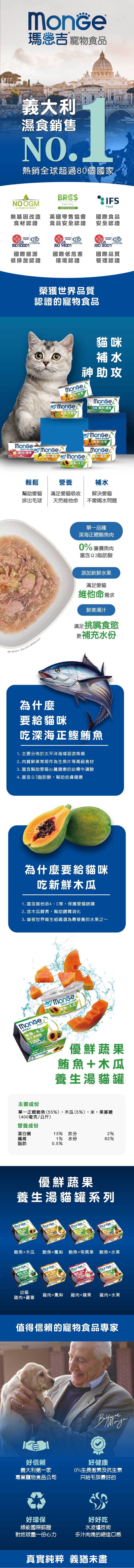 ●內含新鮮正鰹鮪魚及木瓜,滿足愛貓的食慾及天然維生素需求 ●富含鮮美湯汁,幫助愛貓補充水份 ●超過55%單一品種鮪魚,享受優質純魚肉口感及香氣 ●100%海水魚肉富含Ω3脂肪酸,輕鬆幫助愛貓皮毛柔亮 ●特別添加果寡糖,幫助愛貓腸道健康 ●全程無殘忍動物實驗,不含色素、防腐劑與劣質脂肪